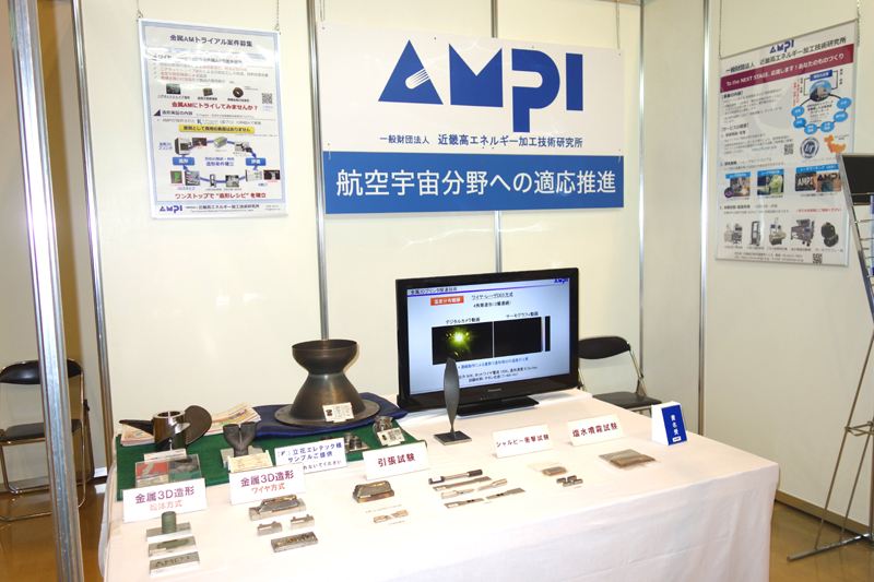 ブース内では、金属積層造形技術のサンプルとして航空宇宙分野向けの部品を模擬した複雑形状のワークを展示しました。また、AMPIで実施した造形条件探索の試験体や材料評価試験片なども展示して、金属3Dプリンティング(AM)技術に関する研究開発の推進と、同技術の社会実装に向けた用途開発(ものづくり企業からのAM適用テーマ募集)を行っていることをメインにPRを行ないました。